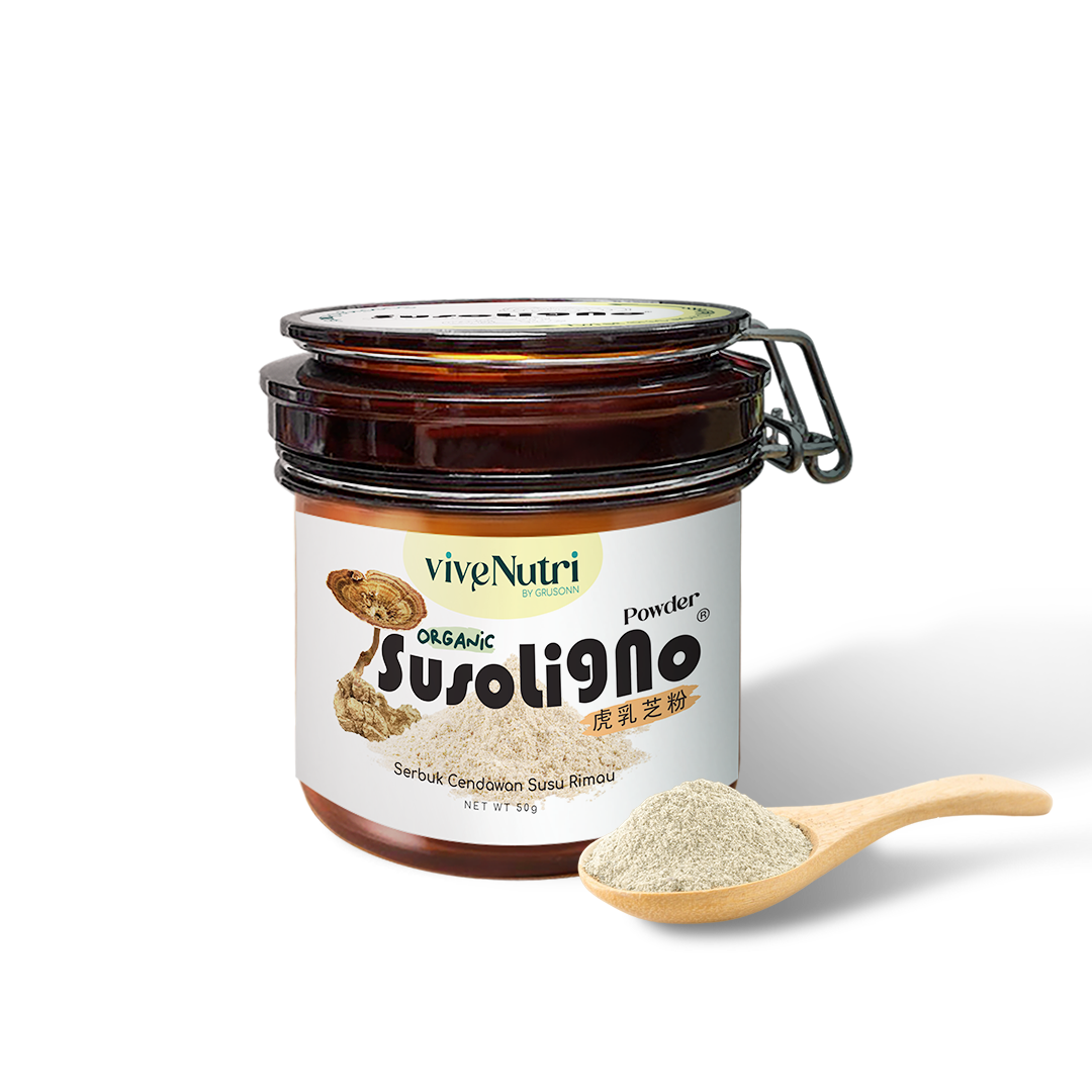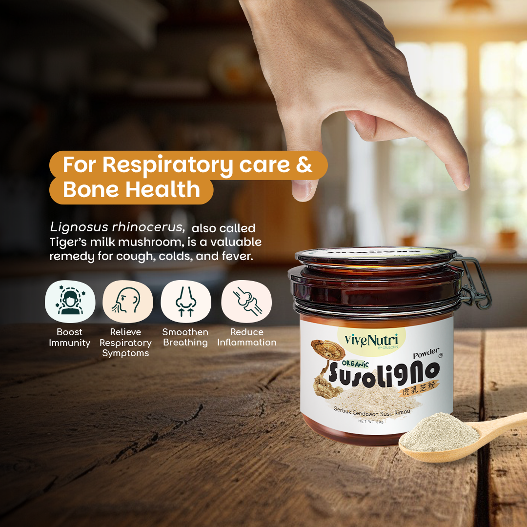 ViveNutri Susoligno Powder (Lignosus rhinocerus) also called Tiger’s milk mushroom, is a valuable remedy for cough, colds, and fever.