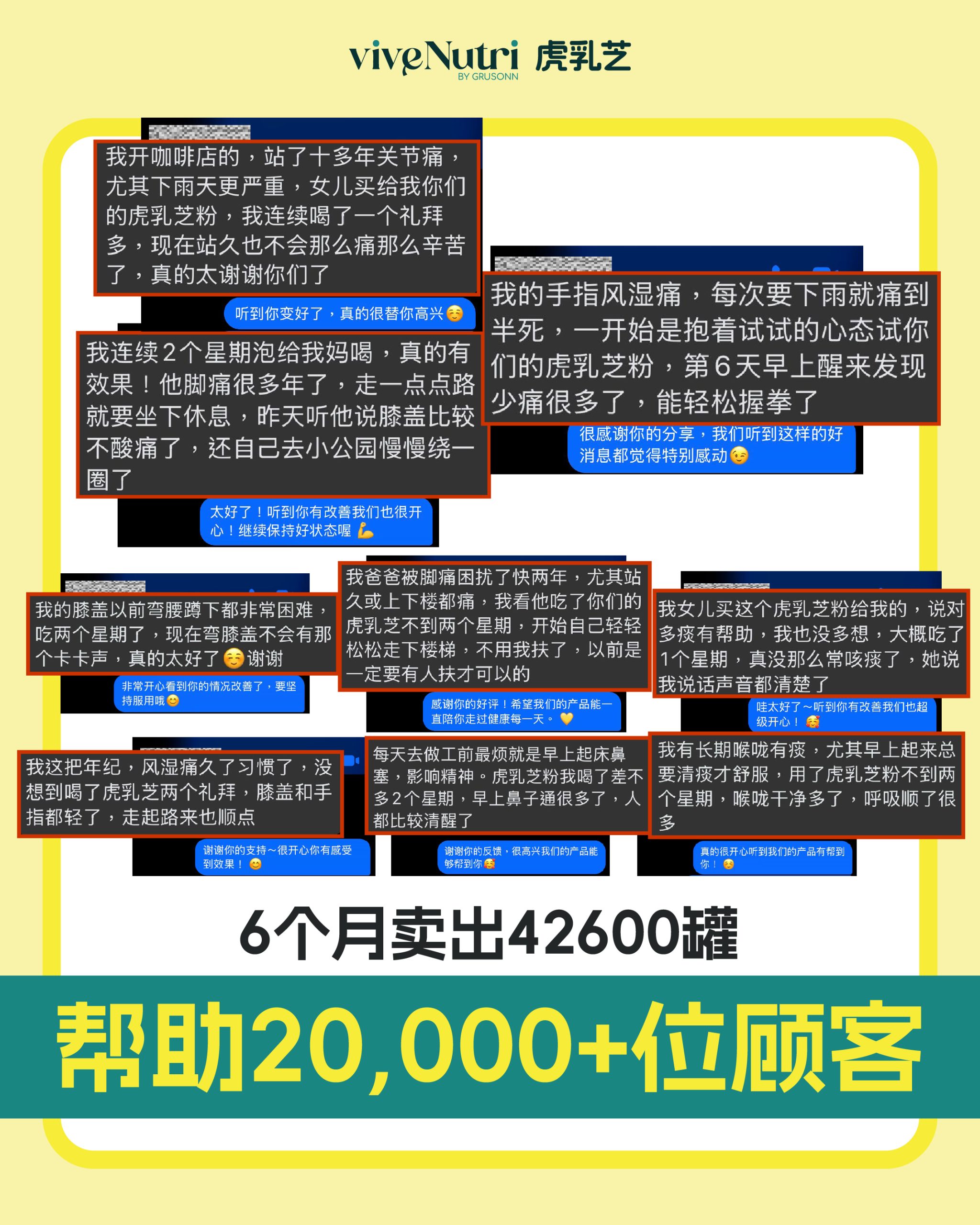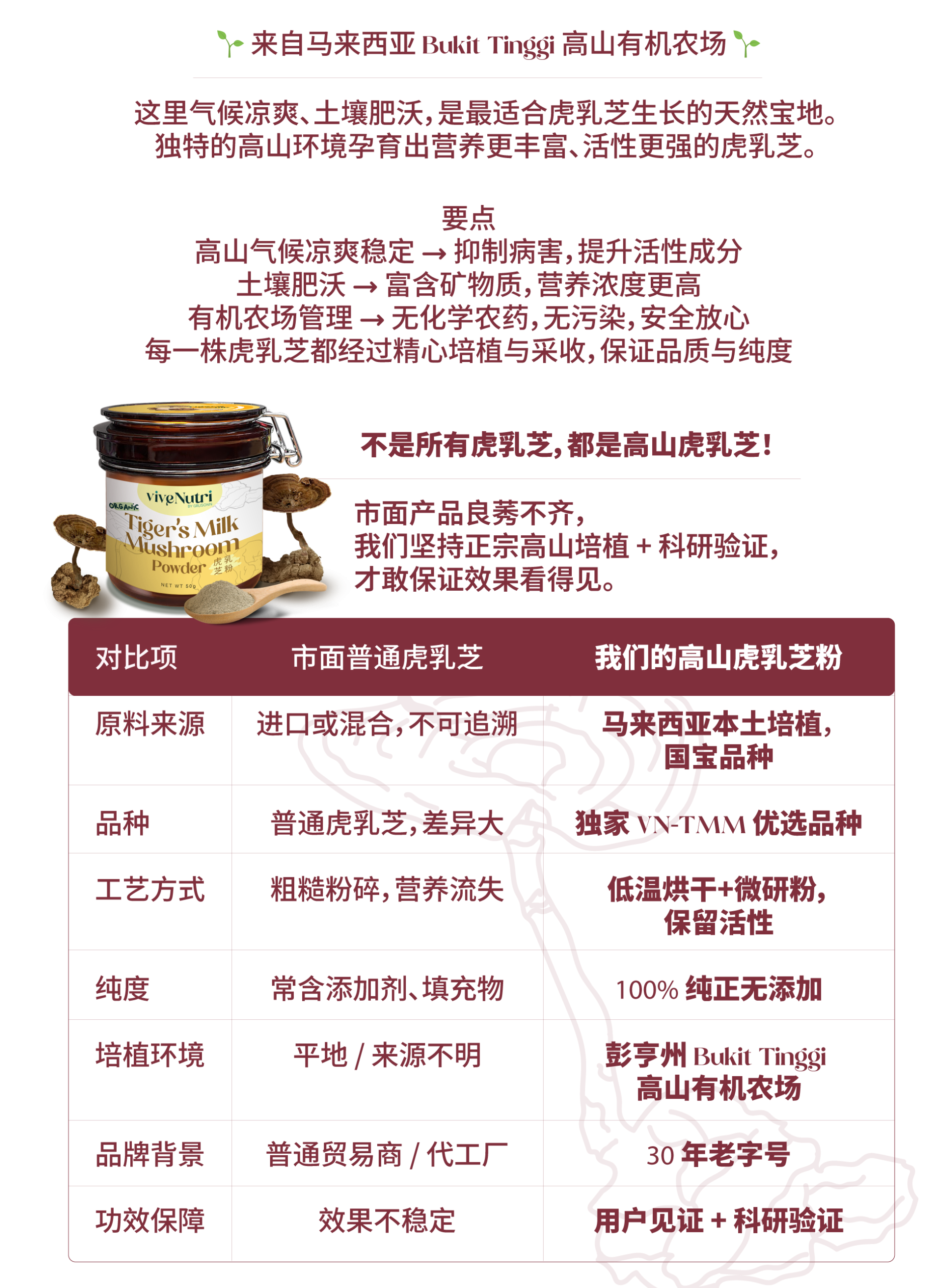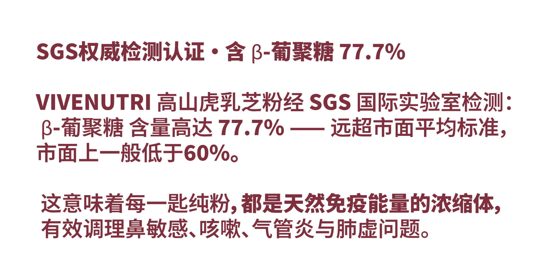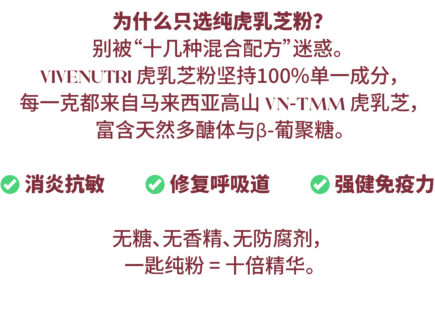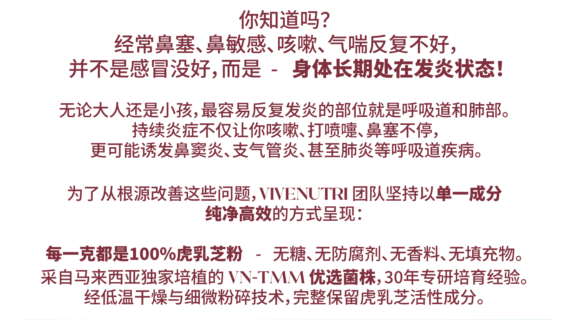 半夜两点,孩子又咳醒了。 “药都吃完一轮了 为什么还是没好?” 你有没有这样的夜晚? 隔天醒来,孩子的黑眼圈深深,自己也没有精神。 孩子咳得满屋都是声,老公的烟咳还没断, 自己鼻子塞到睡不着,一家人都在「呼吸不顺」里煎熬。 其实,问题不只是感冒。 那是身体的防线在警告你:肺与免疫系统正在变弱。 从根源调理呼吸系统· 4大核心优势 顾客好评见证 他们的改善,看得见! viveNutri 高山虎乳芝背后的故事